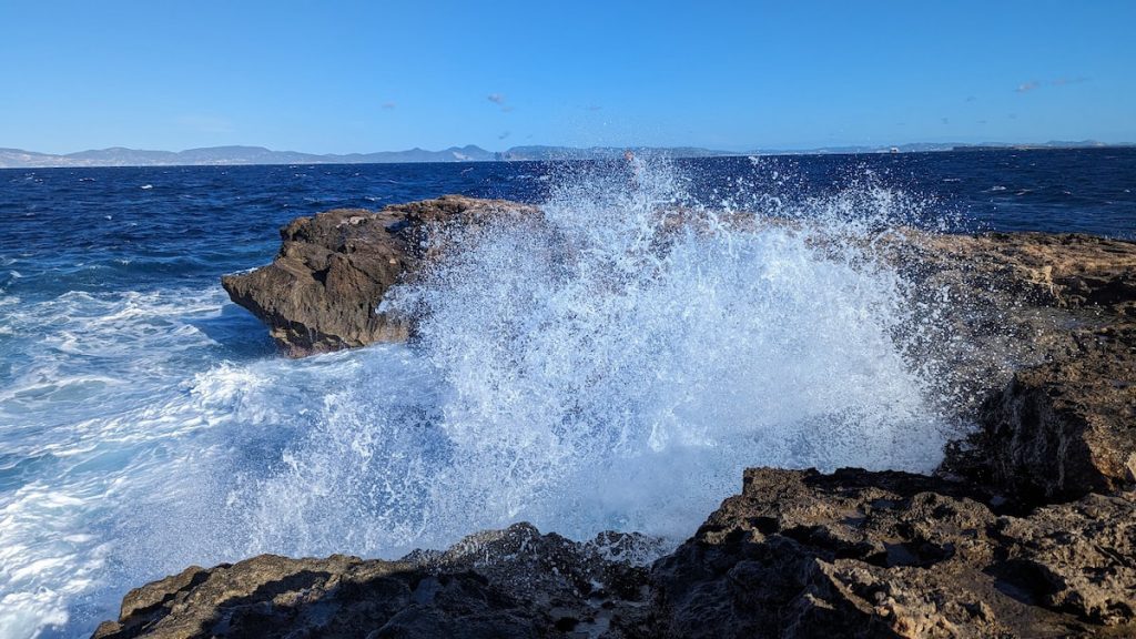 - Una ola rompiendo contra las rocas en la costa de Mallorca. Foto de Gildas Michel.